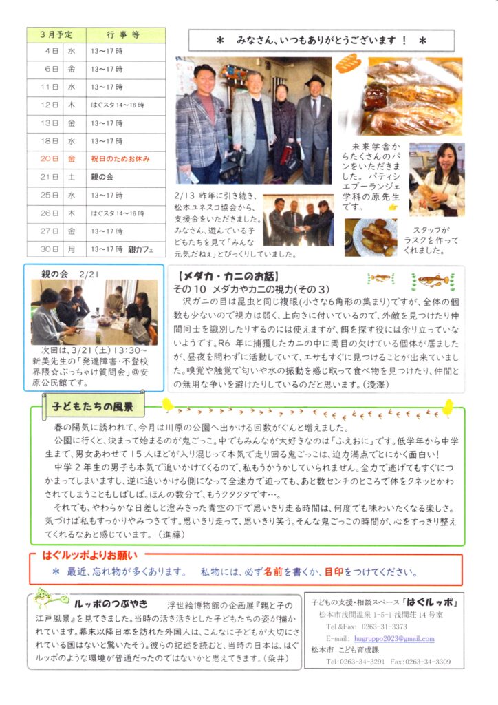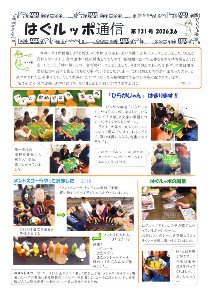 はぐルッポ通信(第131号)を発行しました。(不登校・不登校傾向、登校拒否などの状態にある子どもたちへの居場所提供、相談支援) 2026 3/06 はぐルッポ はぐルッポ通信 2026年3月6日 2026年3月6日 はぐルッポ はぐルッポ通信 はぐルッポ 不登校 不登校支援 不登校相談 子ども 子育て 居場所 松本市 相談 はぐルッポ通信(第130号)を発行しました。(不登校・不登校傾向、登校拒否などの状態にある子どもたちへの居場所提供、相談支援) 関連記事 はぐルッポ通信(第130号)を発行しました。(不登校・不登校傾向、登校拒否などの状態にある子どもたちへの居場所提供、相談支援) 2026年2月6日 はぐルッポ通信(第129号)を発行しました。(不登校・不登校傾向、登校拒否などの状態にある子どもたちへの居場所提供、相談支援) 2026年1月9日 はぐルッポ通信(第128号)を発行しました。(不登校・不登校傾向、登校拒否などの状態にある子どもたちへの居場所提供、相談支援) 2025年12月9日 はぐルッポ通信(第127号)を発行しました。(不登校・不登校傾向、登校拒否などの状態にある子どもたちへの居場所提供、相談支援) 2025年11月8日 はぐルッポ通信(第126号)を発行しました。(不登校・不登校傾向、登校拒否などの状態にある子どもたちへの居場所提供、相談支援) 2025年10月17日 はぐルッポ通信(第125号)を発行しました。(不登校・不登校傾向、登校拒否などの状態にある子どもたちへの居場所提供、相談支援) 2025年9月19日 はぐルッポサイトがオープンしました 2025年8月27日 お知らせ 2025年7月28日