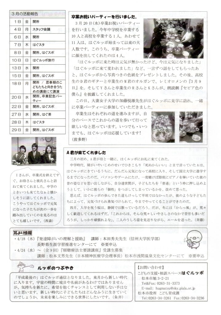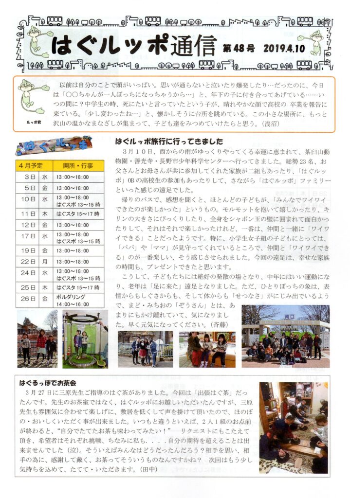 はぐルッポ通信(第48号)を発行しました。(不登校、不登校傾向、登校拒否などの状態にある子どもへの居場所提供・相談支援) 2019 4/12 はぐルッポ通信 2019年4月12日 2019年4月12日 はぐルッポ通信48号を発行しました。 はぐルッポ通信 はぐルッポ通信(第47号)を発行しました。(不登校、不登校傾向、登校拒否などの状態にある子どもへの居場所提供・相談支援) はぐルッポ通信(第49号)を発行しました。(不登校、不登校傾向、登校拒否などの状態にある子どもへの居場所提供・相談支援) 関連記事 はぐルッポ通信(第127号)を発行しました。(不登校・不登校傾向、登校拒否などの状態にある子どもたちへの居場所提供、相談支援) 2025年11月8日 はぐルッポ通信(第126号)を発行しました。(不登校・不登校傾向、登校拒否などの状態にある子どもたちへの居場所提供、相談支援) 2025年10月17日 はぐルッポ通信(第125号)を発行しました。(不登校・不登校傾向、登校拒否などの状態にある子どもたちへの居場所提供、相談支援) 2025年9月19日 はぐルッポ通信(第124号)を発行しました。(不登校・不登校傾向、登校拒否などの状態にある子どもたちへの居場所提供、相談支援) 2025年7月20日 はぐルッポ通信(第123号)を発行しました。(不登校・不登校傾向、登校拒否などの状態にある子どもたちへの居場所提供、相談支援) 2025年7月11日 はぐルッポ通信(第122号)を発行しました。(不登校・不登校傾向、登校拒否などの状態にある子どもたちへの居場所提供、相談支援) 2025年6月6日 はぐルッポ通信(第121号)を発行しました。(不登校・不登校傾向、登校拒否などの状態にある子どもたちへの居場所提供、相談支援) 2025年5月16日 はぐルッポ通信(第118号)を発行しました。(不登校・不登校傾向、登校拒否などの状態にある子どもたちへの居場所提供、相談支援) 2025年2月11日