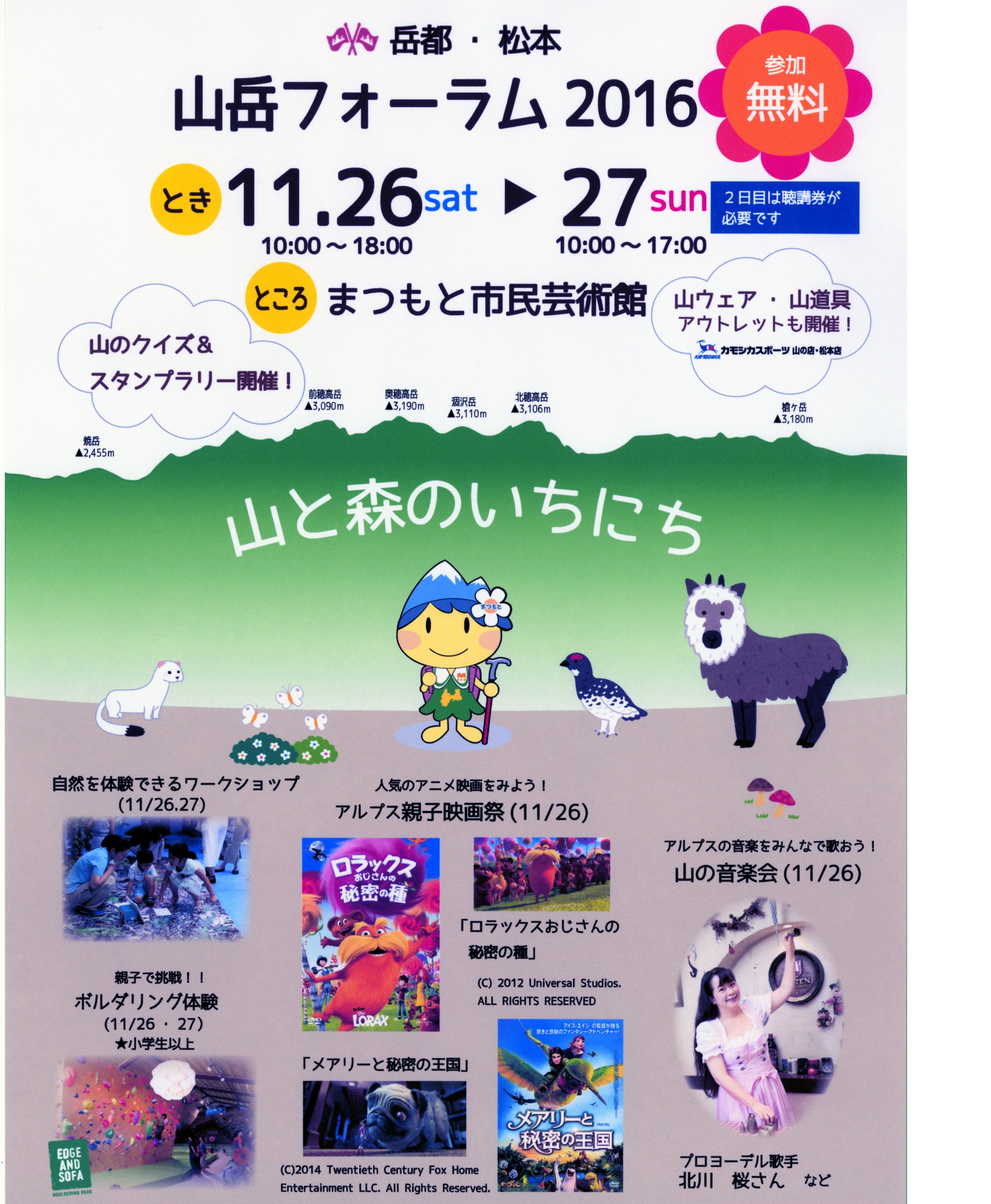 ※ 27日ステージプログラムに参加される場合のみ、聴講券の事前申し込みが必要です。聴講券は山岳フォーラム公式HP(下記サイト )からお申し込みください。先着順ですので、定員になり次第締め切りますので、お早めにどうぞ!
