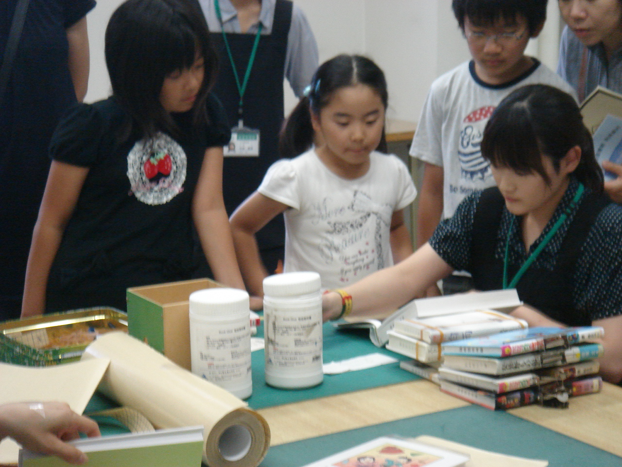 - 図書館の本についている透明なフィルム(ブッカーといいます)を本につける作業の実演です。
